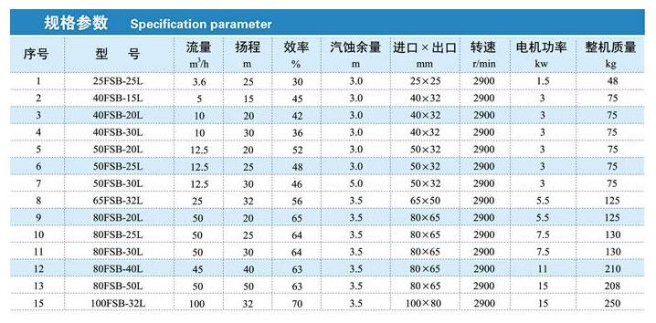 FSB型臥式氟塑料化工泵性能參數(shù):