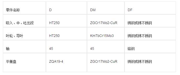 零件名稱 D DM DF 吸入、中、吐出段 HT250 ZGCr17Mo2-CuR 鑄鋼或鑄不銹鋼 葉輪、導(dǎo)葉 HT250 KmTbCr15Mo3 鑄鋼或鑄不銹鋼 軸 45 45 鉻鋼 平衡盤 ZQA19-4 ZGCr17Mo2-CuR 鑄鋼或鑄不銹鋼。