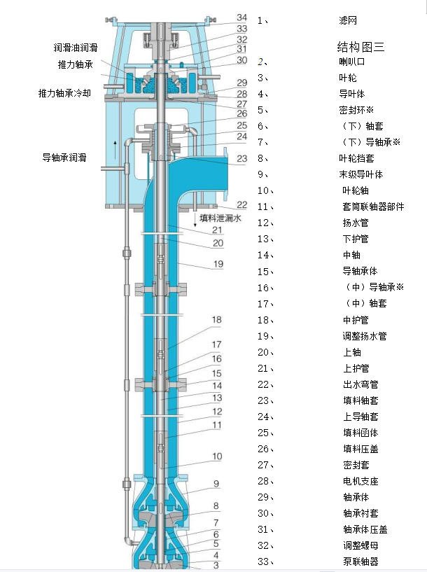 LC型立式長(zhǎng)軸離心泵結(jié)構(gòu)圖及結(jié)構(gòu)特點(diǎn):